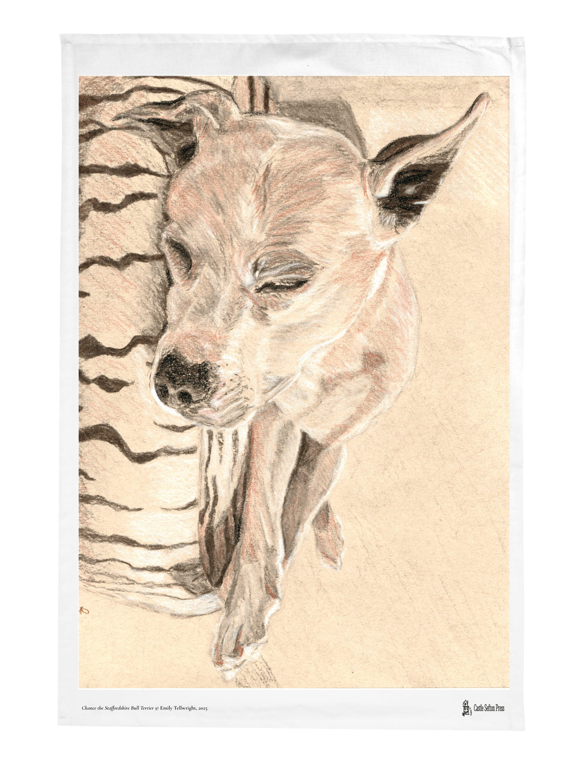The Chance the Staffordshire Bull Terrier tea towel shows a charcoal, chalk and sanguine drawing on Strathmore paper by Emily Tellwright.