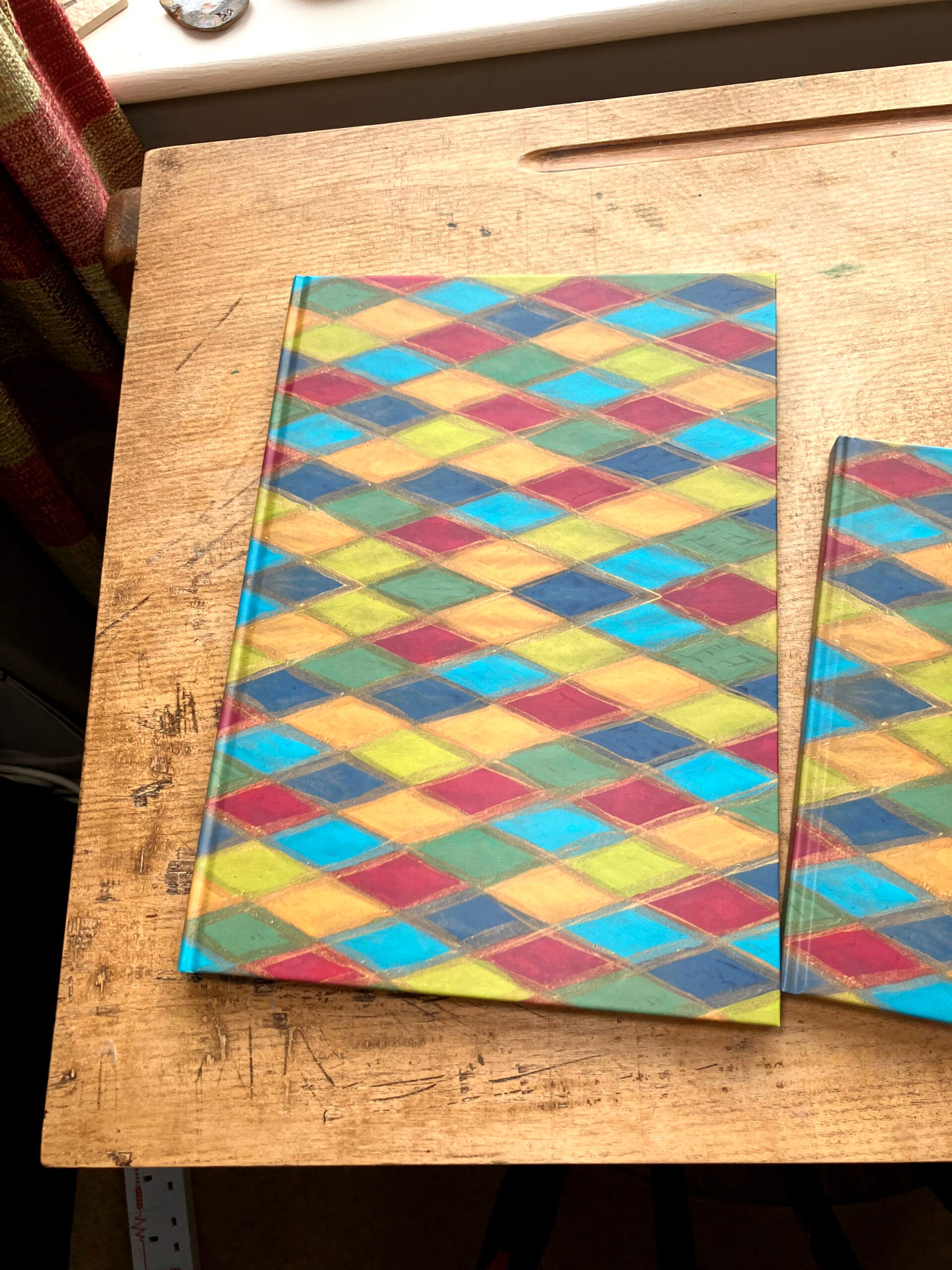 Our Harlequin hardback notebooks showcase a hand-painted gouache design by Emily Tellwright. The rich, semi-opaque colours on a sepia ground capture the luminous quality of stained glass as if projected onto kraft paper. And maybe a hint of the mercurial magic of Harlequin too. It’s a design suitable for all ages, styles and occasions, even Christmas.