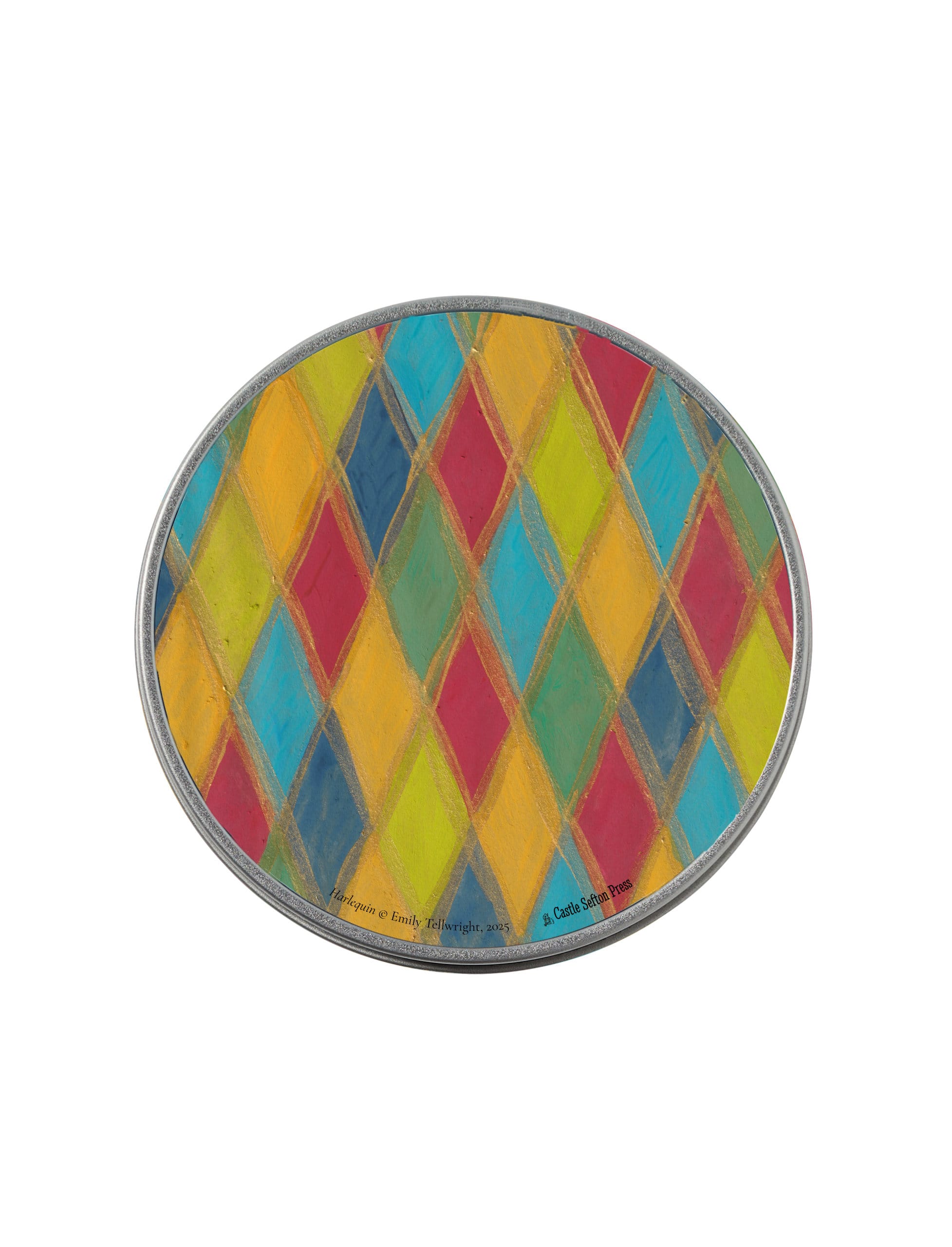 Our Harlequin storage tins showcase a hand-painted gouache design by Emily Tellwright. The rich, semi-opaque colours on a sepia ground capture the luminous quality of stained glass as if projected onto kraft paper. And maybe a hint of the mercurial magic of Harlequin too. It’s a design suitable for all ages, styles and occasions, even Christmas.