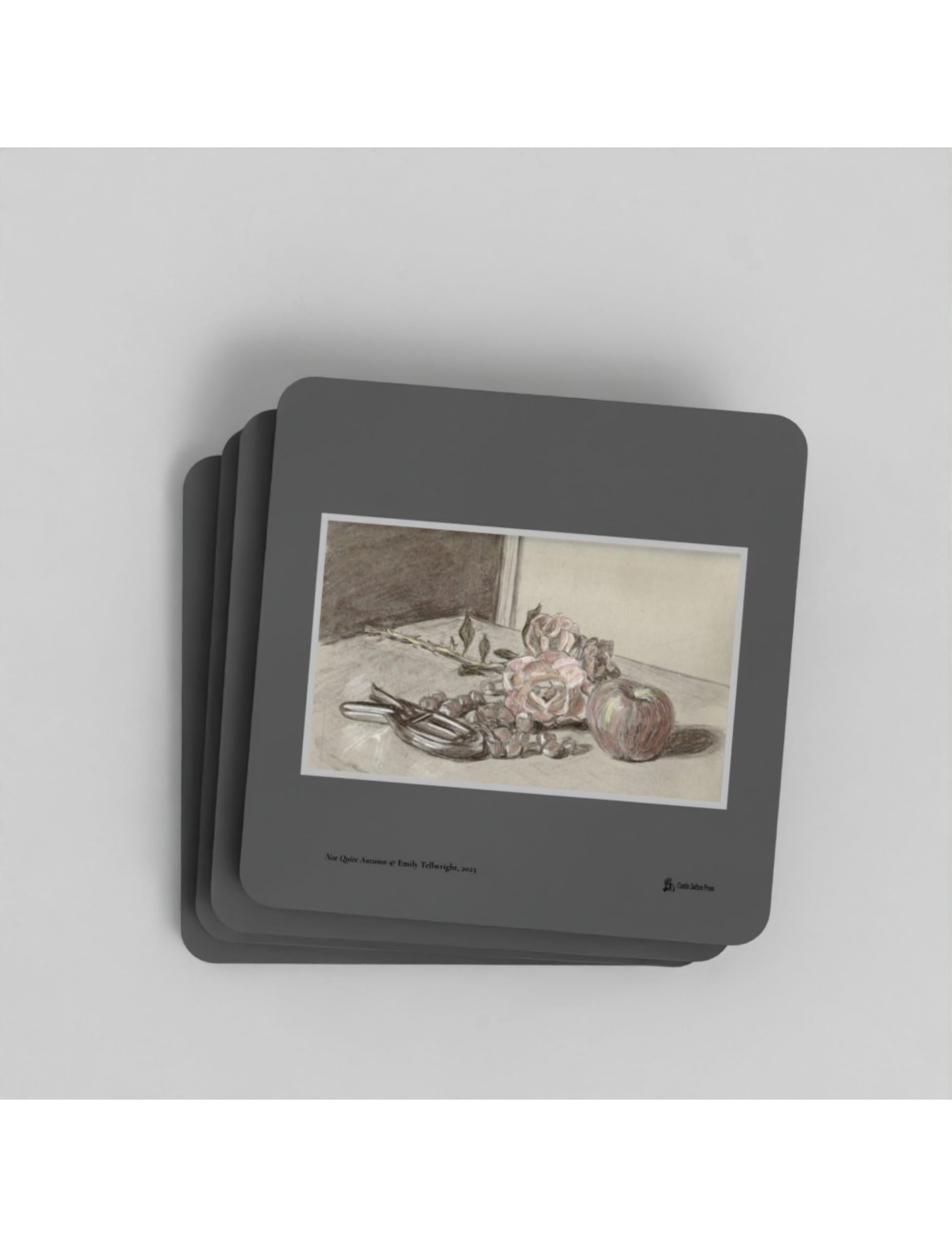 Brighten your home with these cork-backed wooden Not Quite Autumn coasters showcasing a charcoal, chalk and coloured pencil drawing by Emily Tellwright. Great for displaying on coffee tables and protecting surfaces from water marks and drink stains.