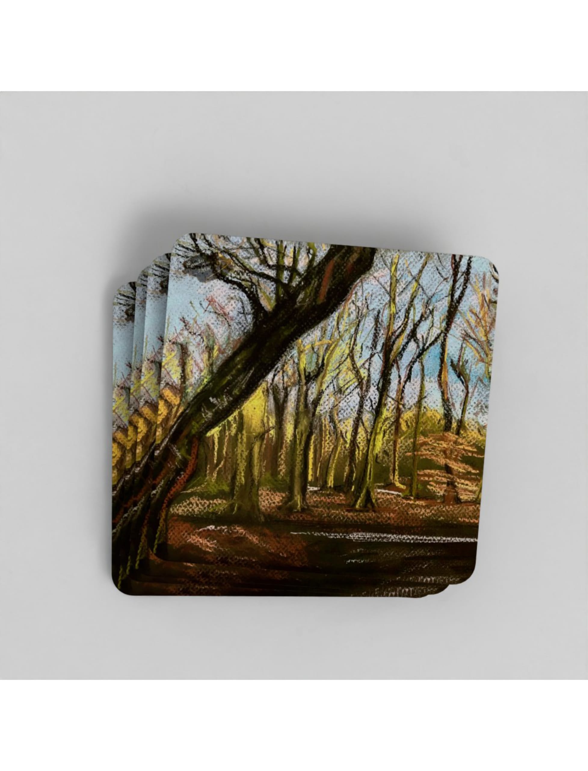 The Winter Woodland coasters show a pastel drawing on Ingres paper by Emily Tellwright. This woodland scene in is Biddulph Grange Country Park, Staffordshire UK. It celebrates the glowing colours of the bare trees and scrub in the winter sunshine. British winters can be dark and dull, so we need to celebrate light and colour whenever we can!